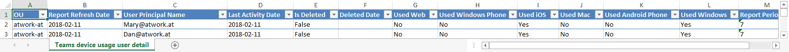 Shows the devices used for accessing Microsoft Teams per user for the selected time period.