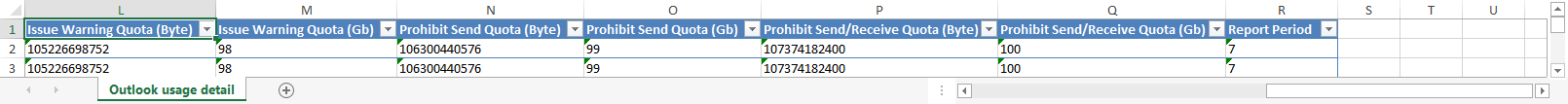 This reports delivers detailed information about mailbox usage as the mailbox size and number of items, the quota and warning limits per user in the selected time period.