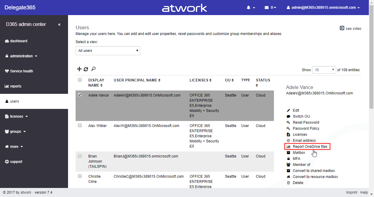 OneDrive files report generation: In the users list, a new menu is available for the selected user: Report OneDrive files generates a report about all files of the user that are existing in the personal OneDrive for Business storage and what files are shared with whom. A use case for this report is that if a user leaves the organization, the admin can see what files have been shared with other users. Then, these common files could be transferred to another user’s OneDrive, SharePoint site or similar. So, the report shows these shared files as well.