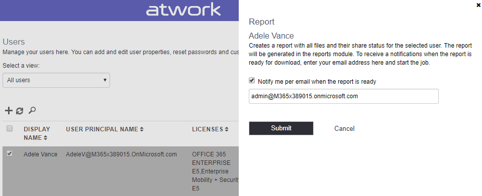 **A pane opens asking for a notification email address. The signed-in admin is automatically existing in the email field. The generation of the report can take a longer time, if the user has thousands files stored, each file must be checked and looked up, if it was shared or not. So, a notification makes sense in most cases to see the report, when it’s available.