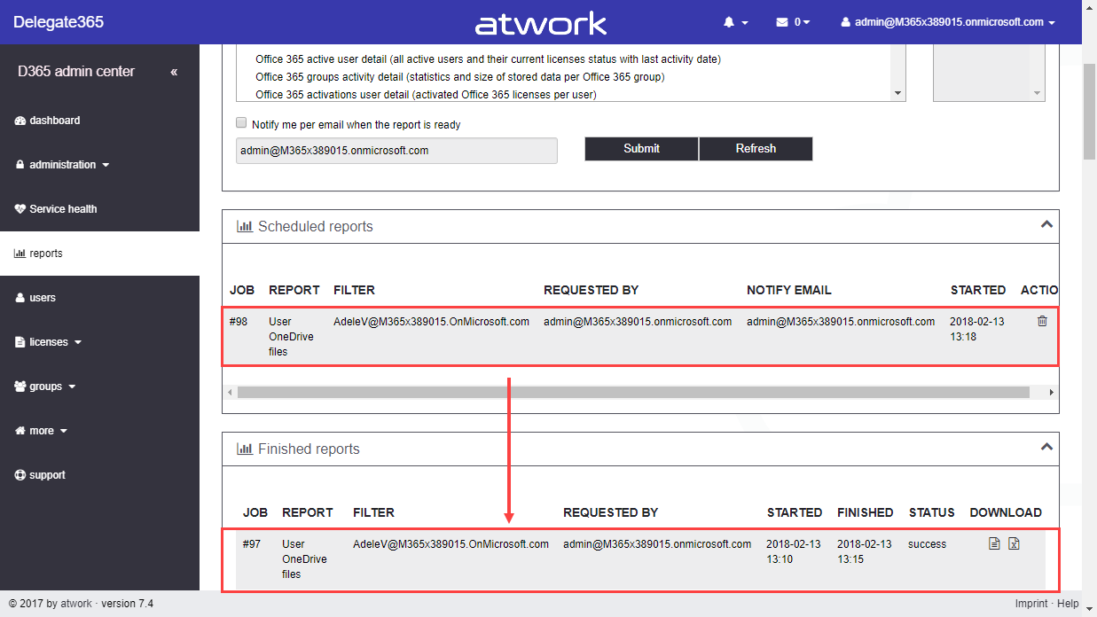 When clicking Submit, the report engine gets a new job and the OneDrive files report task is visible in the reports menu in the Scheduled reports box.