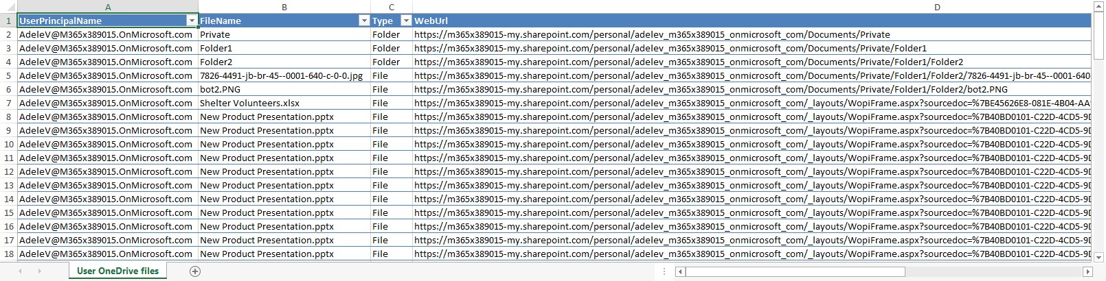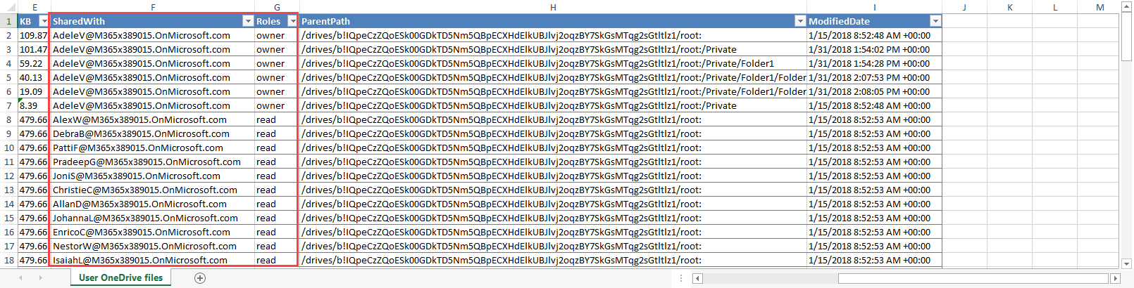 Basically, SharedWith always shows the file owner, in this sample, AdeleV. If the file is shared with other users, there is a line for each user with his Roles is added to the report as seen here.