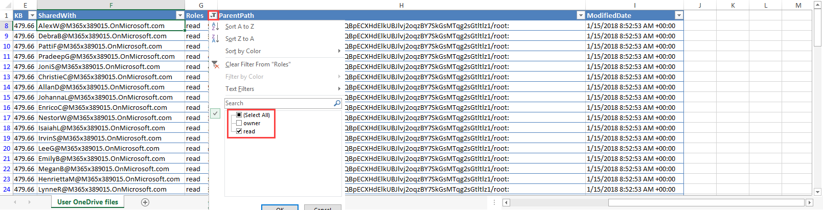 In Excel, filtering is simple: If you want to see all shared with, filter the Roles for all other roles as “owner”, here only “read”: