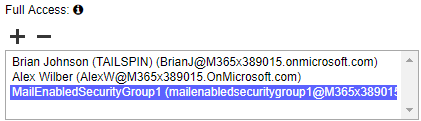 Then, the (new) Mail Enabled Security Group can be added as member for a user’s mailbox delegation. In this sample, we assign the group “MailEnabledSecurityGroup1” with the permission* Full Access* to AdeleV’s mailbox. All members of that group have access to that mailbox.