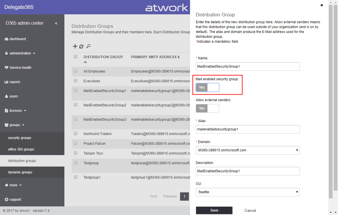 Using group membership: You can create a new Mail Enabled Security Group in Delegate365 in groups / distribution groups (basically, a Mail Enabled Security Group is a Distribution Group in Office 365). Ensure that the “Mail enabled security group” switch is set to Yes.