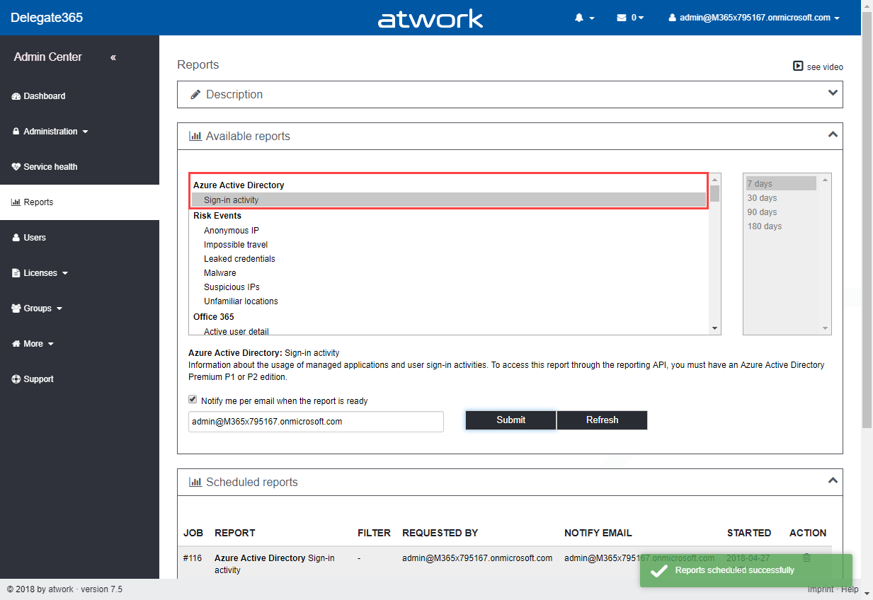So, Delegate365 reporting allows powerful statistics of all (entitled) sign-ins within your Office 365 tenant and even for Scope-Admins for their data.New GDPR-module: Portal-Admins get a new module in the administration menu named GDPR. This allows to fulfill a user’s request for the right to be forgotten in Delegate365.