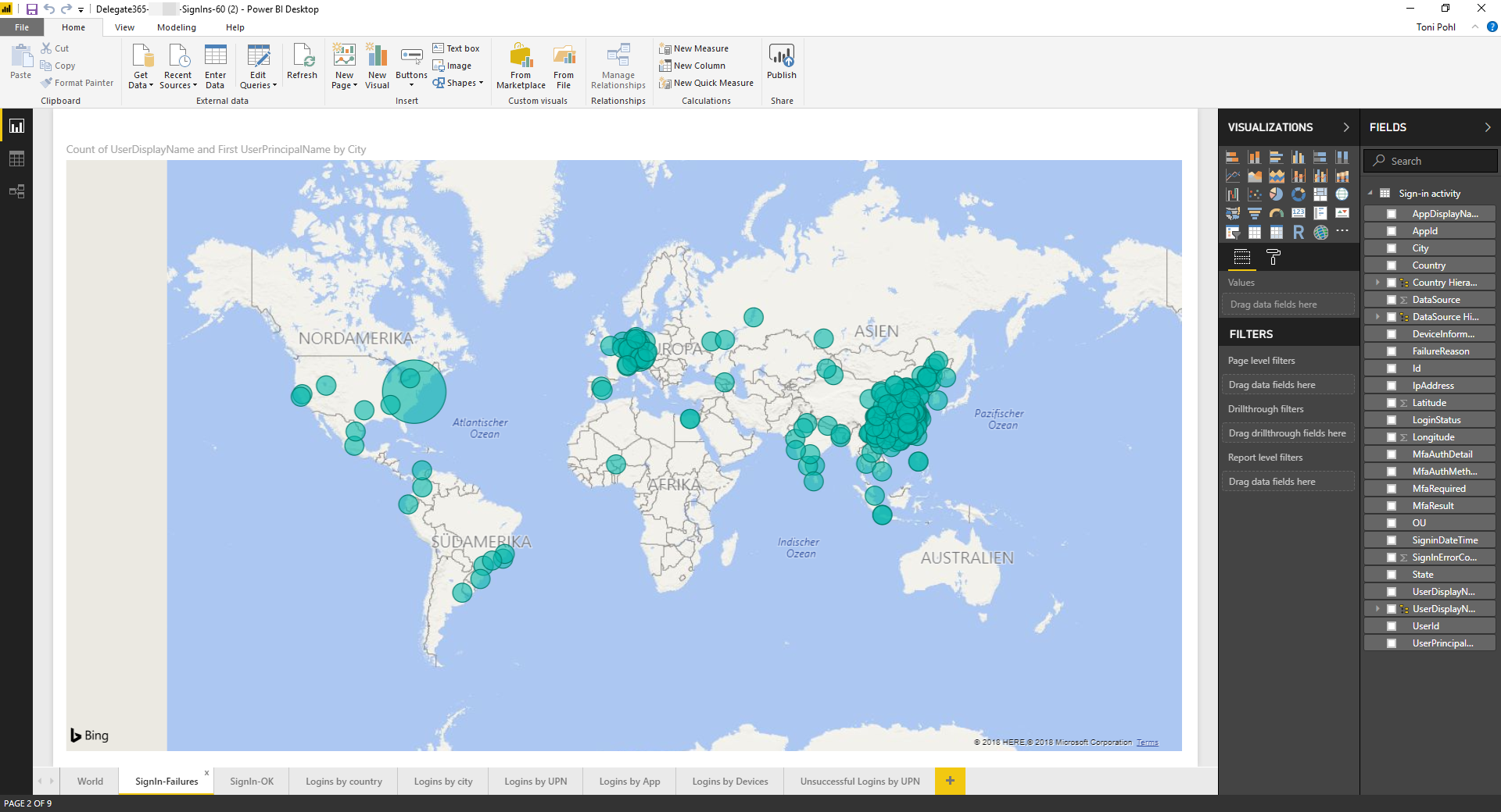 This map powered by Bing, shows unsuccessful logins that were blocked by the Office 365 login system. With that data, you can generate reports as:SignIn-failures