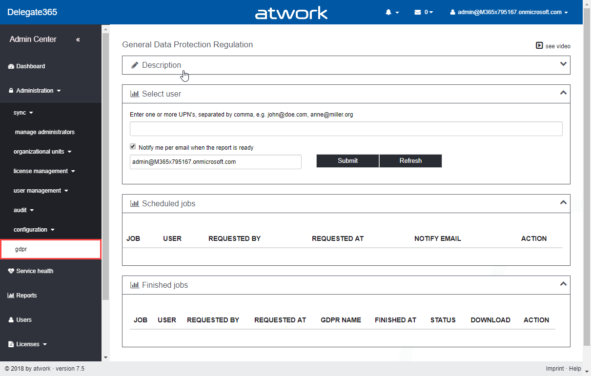 This module works analogous to the report module. Portal-Admins can create a job to delete any personal user data from Delegate365’s audit logs. One or more UPNs can be added and submitted in the GDPR form for execution.