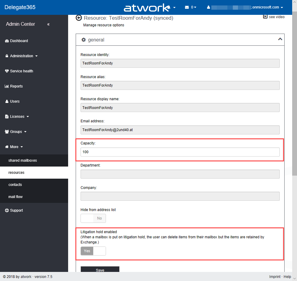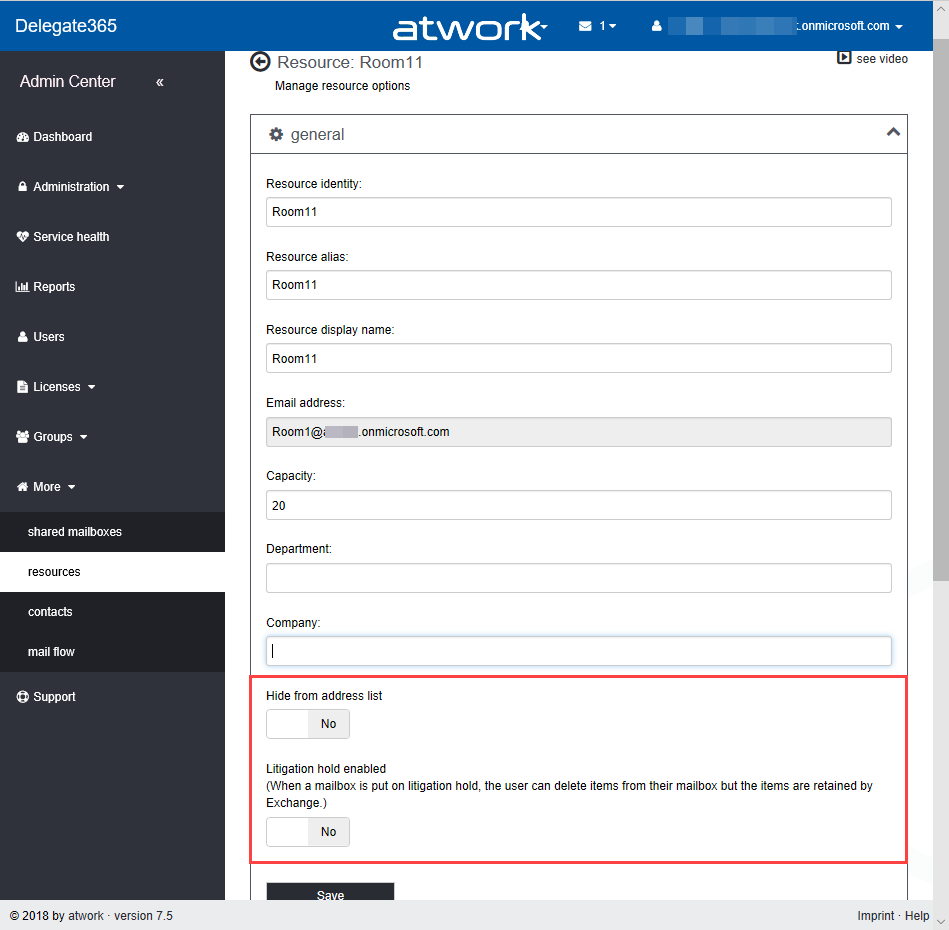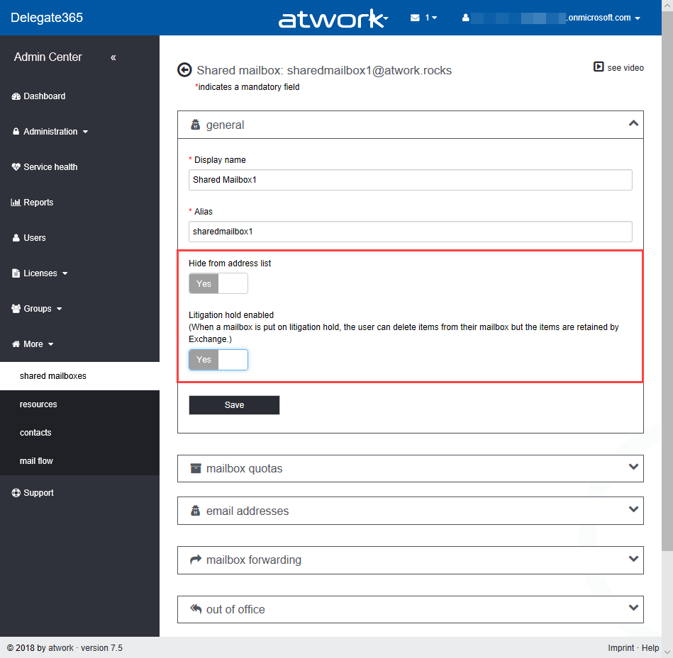 Once the deletion-job is executed (this happens within some minutes), personal data is anonymized in all Delegate365 audit logs. A user name is anonymized as DeletedUserxx (with a current number) and any personal data is cleared in all entries. There is a report generated for each user. If selected, an email is sent to the job owner as in the report module. The generated report informs when and how often the user data has been cleared in the Delegate365 audit logs. With this module, Delegate365 provides a process for the Portal-Admins to fulfill the user’s right to be forgotten consistently.Shared Mailboxes: New Hide from address list and Litigation Hold: These settings can now be controlled in Delegate365 by all Admins. Litigation Hold preserves items in the Recoverable Items folder in the user’s mailbox and can take up to 60 minutes to take effect. Find more about setting Litigation Hold at Place a mailbox on Litigation Hold and In-Place Hold and Litigation Hold in Exchange 2016.