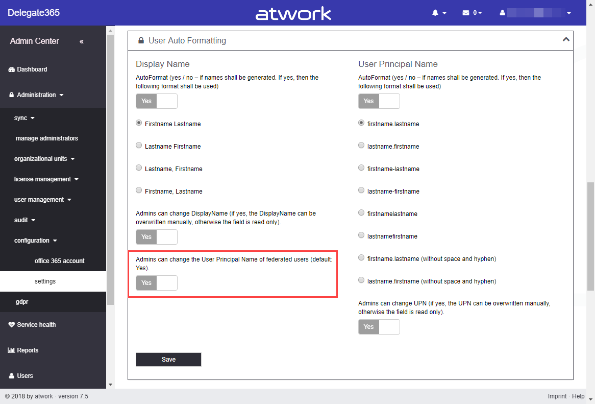 For federated users, the UPN change can now be controlled by Portal-Admins in Delegate365 with this version. By default, it’s set to enable UPN change.Direct link to Delegate365 changelog and articles: In the status line on each page bottom, you see the current Delegate365 version. Now, users can click on the version link to open the atwork blog automatically filtered for articles about Delegate365. The newest article is on top. The direct link is https://bit.ly/d365-blog.