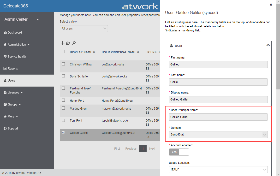 So, a synced resources can now be just edited as here – the remaining properties are disabled.[Updated May 2nd:] Synced Users, enable or disable a UPN change: Changing the UPN can now be controlled in Delegate365. In former Delegate365 versions changing the UPN was always possible for federated users as a feature the Office 36 portal does not provide. Since most organizations using hybrid mode, they manage users only in the on-premises Active Directory as leading system. In that scenario, you want to disable UPN change in Delegate365. Delegate365 knows about each object (cloud) status and deactivates properties that cannot be edited automatically as shown below. Now, this feature can be controlled with a new Admin setting in administration / configuration / settings: “[x] Admins can change the User Principal Name of federated users”.