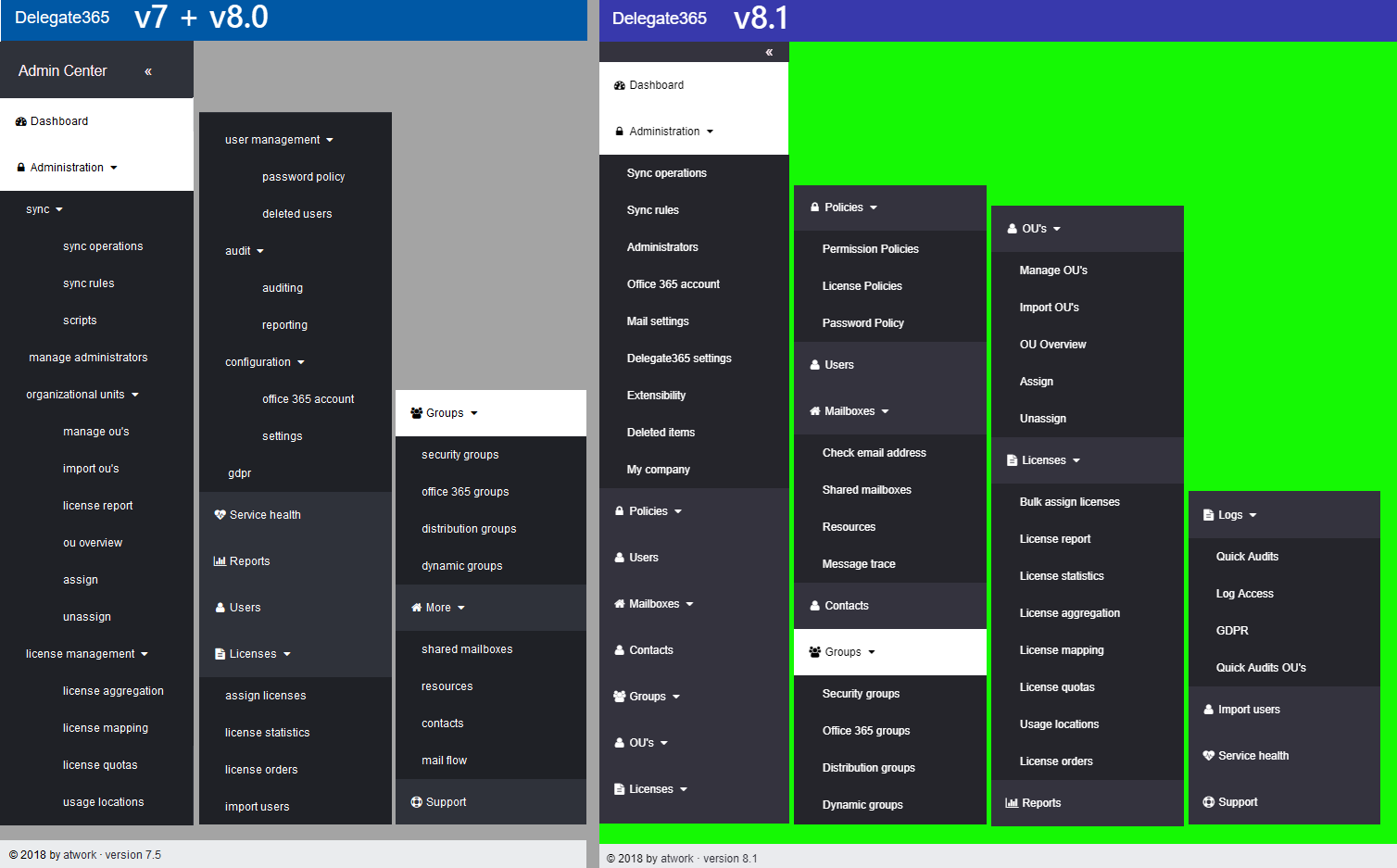 Now, each topic is a group to make it easier for admins to find related features. There are only two instead of three menu levels. Enlarge the following graphics to see all menus and their new position. The left side (gray) shows the full menu of Delegate365 version 7.x and 8.0, the right side (green) shows the new menu Delegate365 version 8.1.