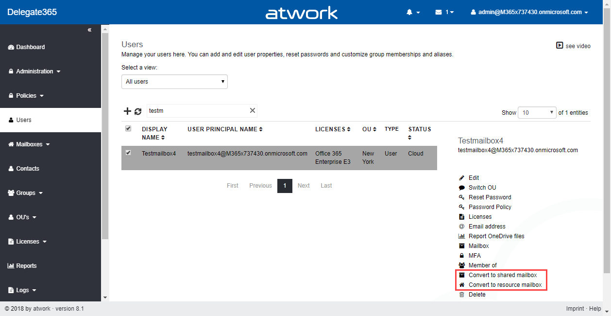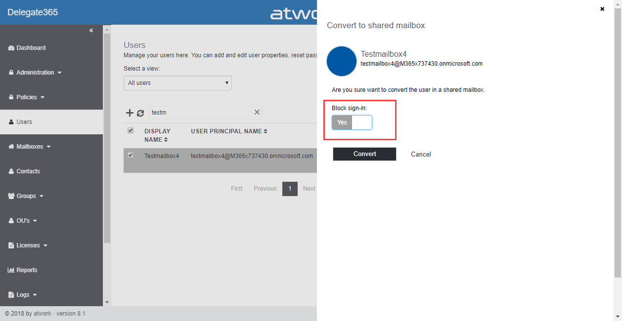 Block user mailbox when converting: If a mailbox is converted from a user mailbox to a Shared Mailbox or to a Resource Mailbox (or vice versa), it can make sense to block the user login in that process. That feature has been added in the convert-process.