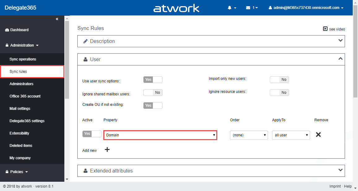 The same works vice versa when a Shared Mailbox or a Resource Mailbox is converted to a user object. Then, it could make sense to active the sign-in option for that mailbox.New: Sync rules support of domains: The User sync rules now can use the domain name for assigning to an OU with the same name, e.g. user john@company1.org could be assigned to OU company1.org without the need to add meta information to the user object or add users to a Security Group. This simplifies such automatic OU-assignments.