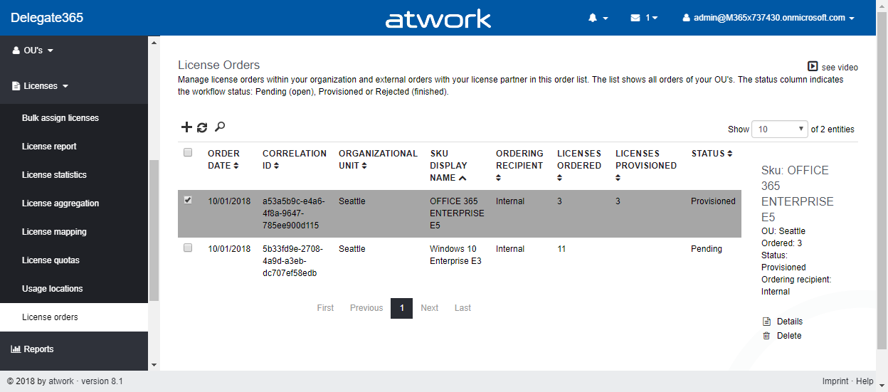 External license order: There’s a permission change here: Before, Administrators could only see their own order requests. Now, the order license order list shows order request of all entitled OU’s. This makes sense, since Admins can now see orders for their OU’s made by other Admins (for the OU). Also, for our CSP customers, the simple order workflow can now be used for ordering external Office 365 licenses as well. This will be covered in an extra article.