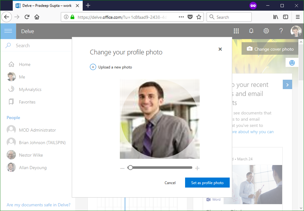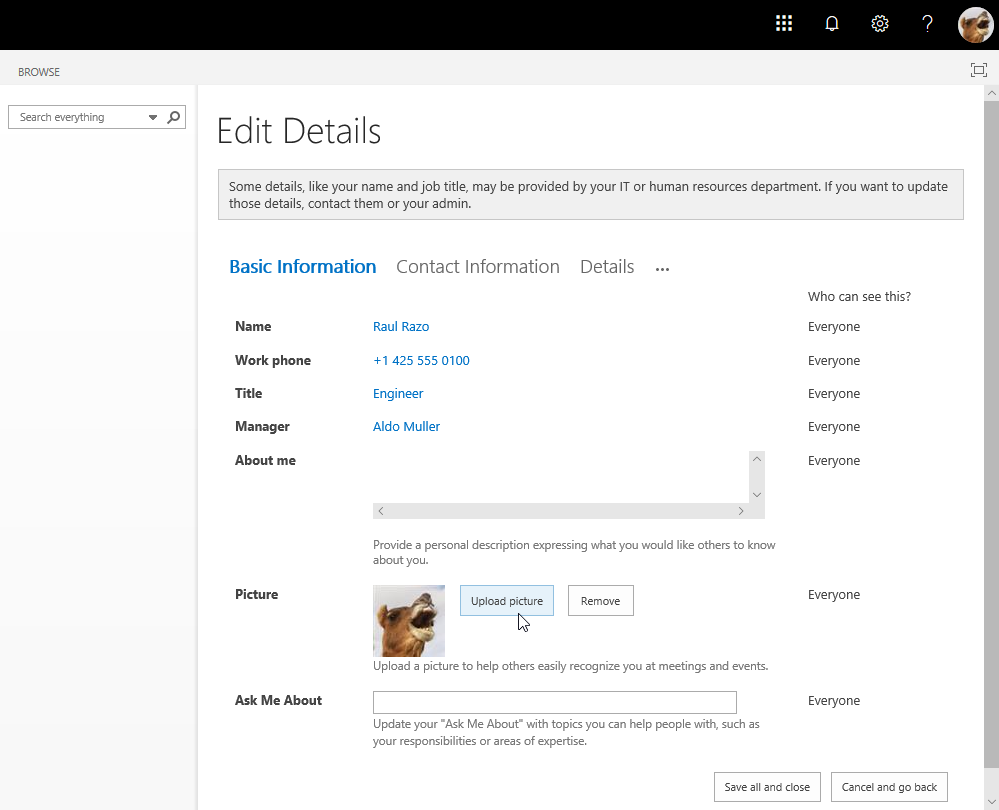 So, here I uploaded a new profile picture for that user. When saving, the update can take some time - usually up to 24 hours till the SharePoint User Sync writes the updated data into the AAD user profile…