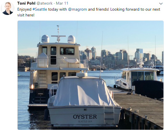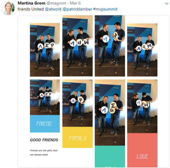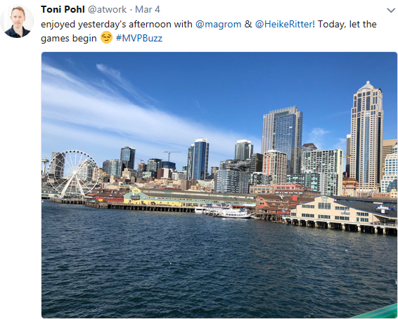 …and a lot of cool group photos and around the event. To share some impressions and memories, I added some personal tweets and snapshots from that week combined with tweets from #MVPSummit here (click to enlarge). Before the event we enjoyed the sunshine and went to Bainbridge Island with our friend Heike and had dinner with colleagues and friends…