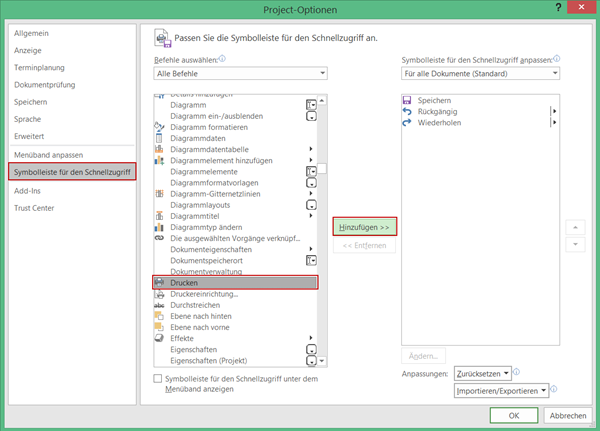Sie können sich die gewünschten Befehle der Symbolleiste *für den Schnellzugriff *hinzufügen. Öffnen Sie dazu das Dialogfenster Project-Optionen über Datei – Optionen. Wechseln Sie zur Ansicht Symbolleiste für den Schnellzugriff. Wählen Sie den gewünschten Befehl aus und klicken Sie auf Hinzufügen. Wenn der gesuchte Befehl nicht angezeigt wird, ändern Sie den Eintrag Häufig verwendete Befehle unter Befehle auswählen, zum Beispiel auf Alle Befehle. Damit werden alle verfügbaren Befehle angezeigt.