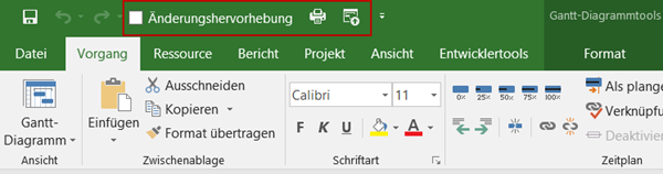 Oft werden aber Befehle vermisst, die nur durch mehrmalige Mausklicks zu erreichen sind, wie zum Beispiel Drucken oder bei Einsatz von Project Online oder Project Server Veröffentlichen.