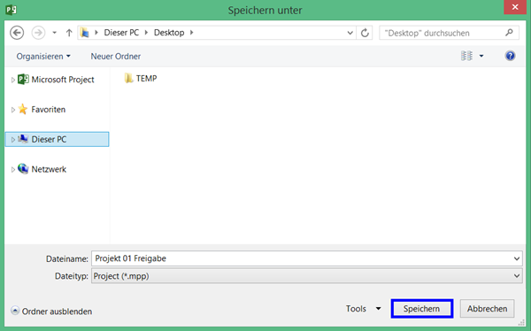 Zudem können Sie diese Methode auch einsetzen, um das Projekt anderen zur Bearbeitung zur Verügung zu stellen, wenn diese keinen Zugriff auf Project Online oder Project Server haben. Das kann über das Speichern auf einem Netzlaufwerk oder auch durch Weitergabe ber E-Mail erfolgen. Wenn Sie die aktualisierte Version zurück erhalten, können Sie sie wie unten beschrieben wieder in Project Online oder auf dem Project Server speichern.