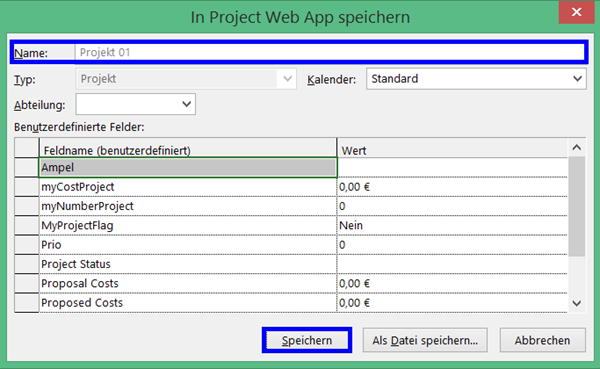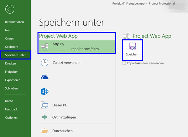 Speichern Sie das Projekt wieder in Project Online oder auf dem Project Server über Datei – Speichern unter – Project Web App – Speichern.