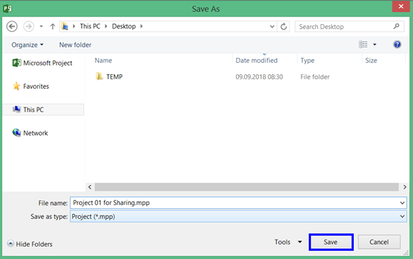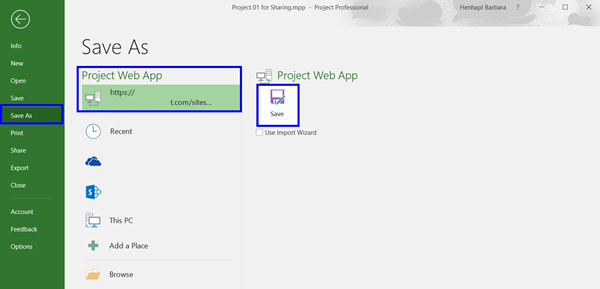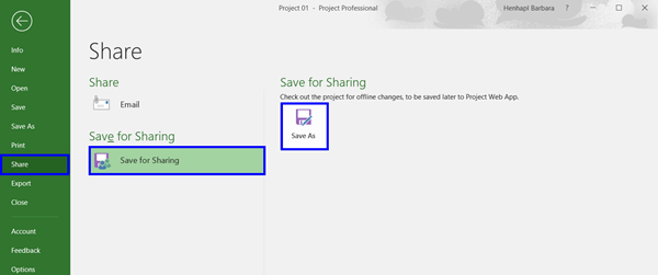 Moreover, you can use this method for a real sharing, if you want others to modify your project with no access to Project Online or Project Server. You can share your project by saving on a network share or sending by email. If you receive the modified version, you can save it back to Project Online or Project Server as described below.