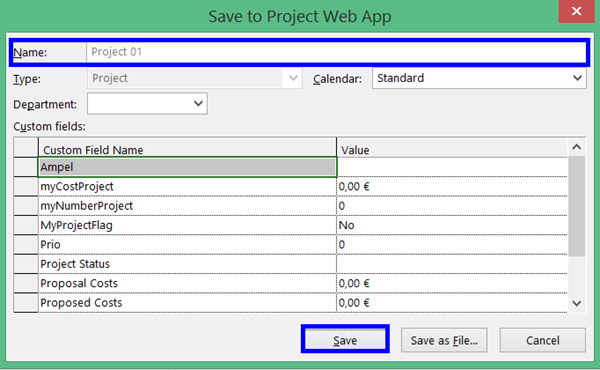 In dialog Save to Project Web App you can’t change the project name. That is an indicator that the existing project will be adjusted and not replaced by a new project. Click on Save to finalize the process.