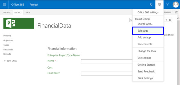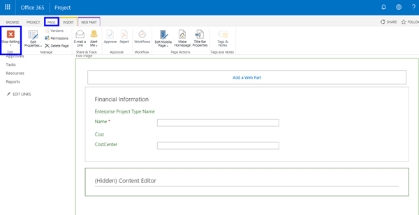 In this article, Enterprise Custom Field CostCenter will be hidden, if there are no cost for the project. Cost is an internal field, so GUID for this field is not known. Moreover, it is a field you cannot edit on an PDP. In one of the net articles you will see that it is easier to get a value of an Enterprise Custom fields if project is checked out. The code of this sample will work for a project, no difference if it is checked out or not. Using a field like cost, we need to look for the field name. If you look at the source of the page, you will see that all field information is provided in a table.