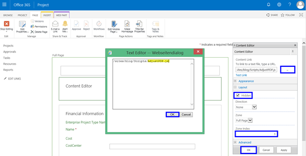 Enter full qualified or relative path to your script. Set Layout to Hidden, users do not want to see this web part. To avoid empty space at the top, set Zone Index to (#WebPartsOnPage – 1) – in this sample two webparts, so the value is 1. Click OK to apply your changes.