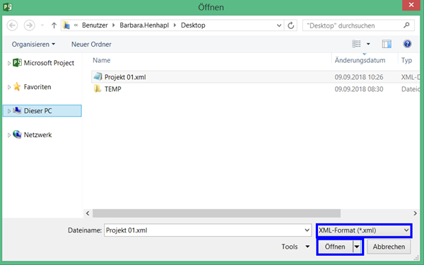 Wenn die Größe einer Projektdatei unerklärlich hoch ist oder Sie einen anderen Verdacht haben, dass Ihre Datei nicht in Ordnung ist, können Sie sie über das Speichern als XML-Datei oft korrigieren. Öffnen Sie dazu Ihren Projektplan. Speichern Sie in als XML-Datei über Datei –Speichern unter. Wählen Sie als *Dateityp das Format XML-Format (.xml).