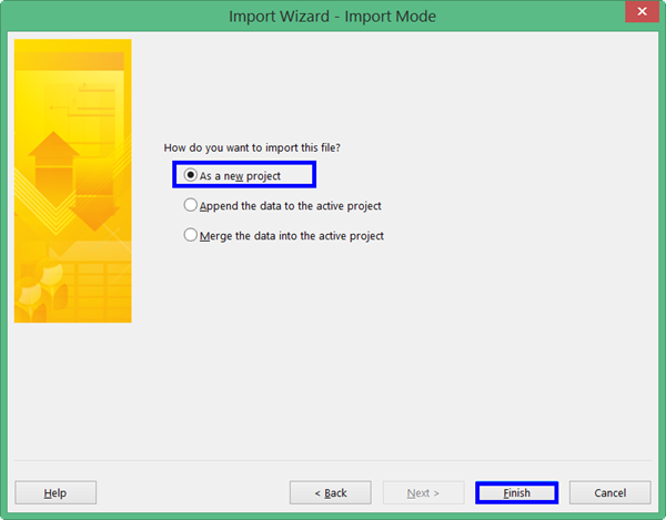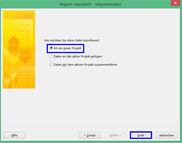 Nach dem Klick auf Öffnen wird der Import-Assistent gestartet. Lassen Sie die Standardoption Als ein neues Projekt aktiviert und klicken Sie auf die Schaltfläche Ende.