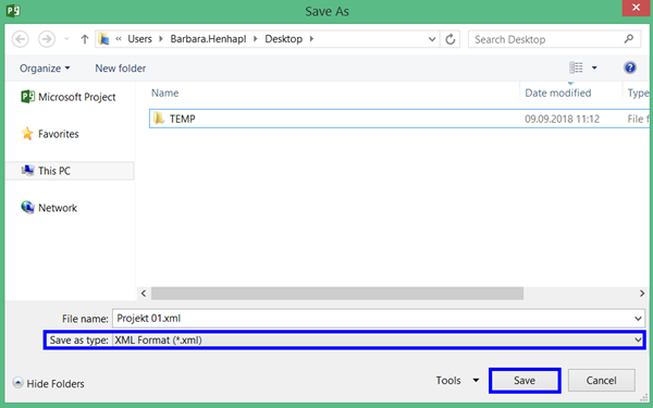 For doing so, open your project. Save your project as XML file using the *File – Save As.Choose XML Format (.xml) as file type.