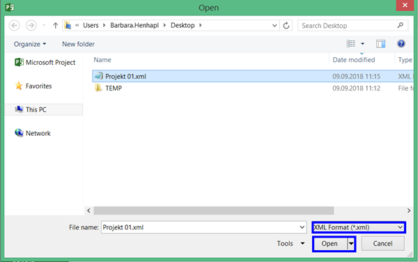 Öffnen Sie die neue XML-Dateii über den Dialog Öffnen. Um die Datei angezeigt zu bekommen, ändern Sie das anzuzeigenden Dateiformat auf XML-Format (.xml)*.
