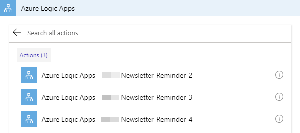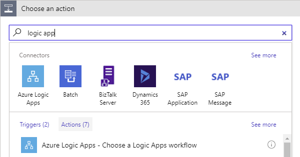 To develop such a scenario, you can add calls to other Logic Apps easily as new action. Search for logic app and select that.