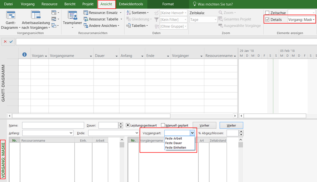 Und es ist in der Ansicht Vorgang Maske enthalten, wenn Sie den Bildschirm teilen. Es gibt drei Vorgangsarten: Feste Einheit, Feste Arbeit und Feste Dauer.
