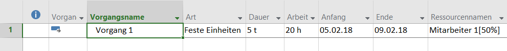Wenn Sie als Vorgangsart Feste Arbeit einstellen, werden Änderungen an Einheit oder Dauer den jeweils anderen Wert beeinflussen. Wieder ist ein Projektteammitglied zu 50% einem Vorgang mit der Dauer von 5 Tagen und damit Arbeit von 20 Stunden zugeordnet.