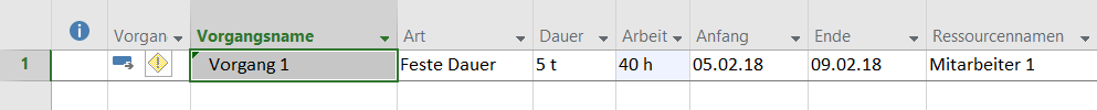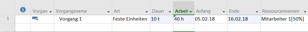 Wenn Sie als Vorgangsart Feste Einheit wählen, werden Änderungen an *Arbeit *die Dauer beeinflussen und umgekehrt, da die Einheiten unverändert bleiben sollen. Ein Beispiel: