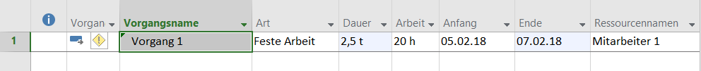 Nach Änderung der Zuordnungseinheit auf 100% wird die Dauer von Project auf 2,5 Tage verkürzt, da die Arbeit von 20 Stunden gemäß Vorgangsart Feste Arbeit unverändert bleiben muss.