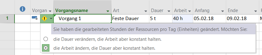Wenn Sie den Wert ändern, der als “Fest” gewählt ist, passt Project das Verhalten entsprechend an.