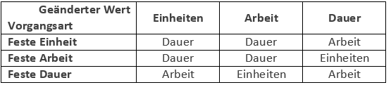 Wenn Sie als Vorgangart Feste Dauer wählen, wird die Dauer unverändert bleiben und Änderungen an Arbeit und Einheit jeweils den anderen Wert modifizieren.