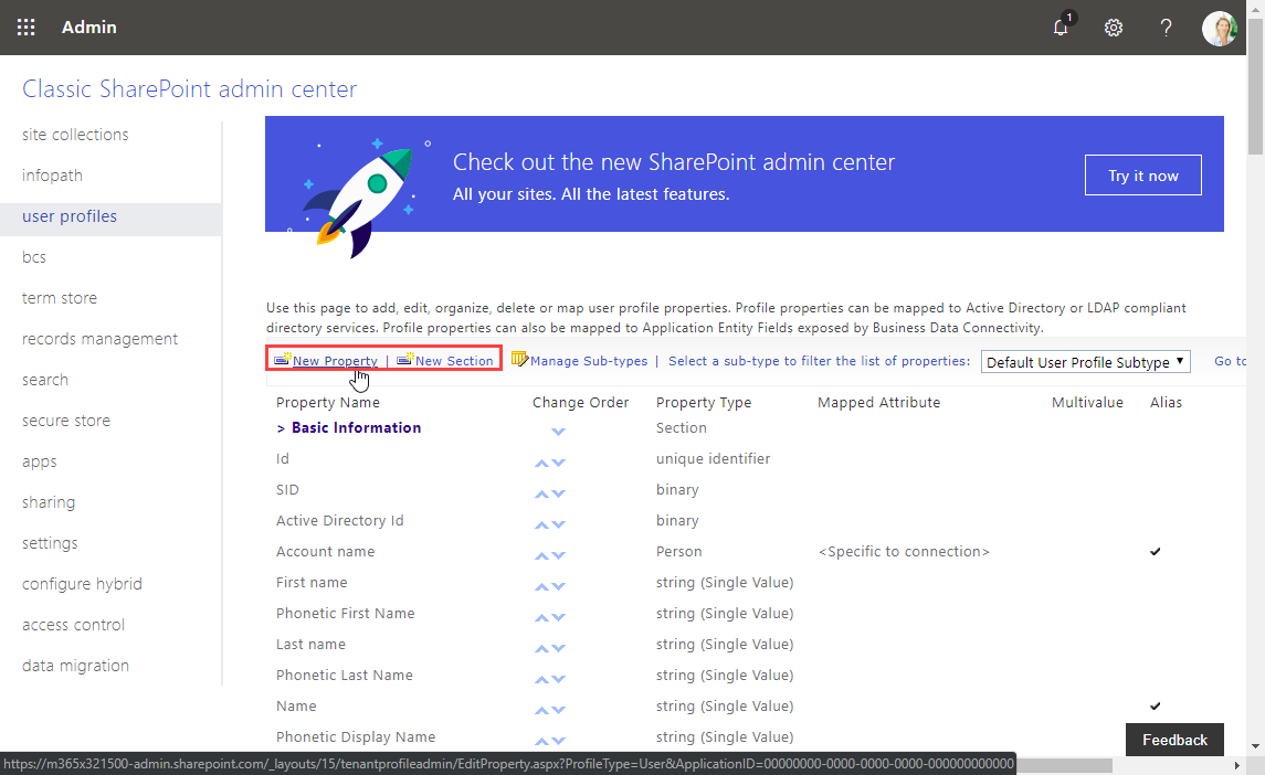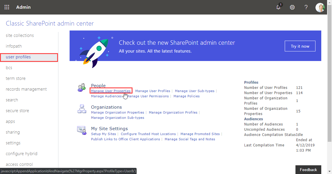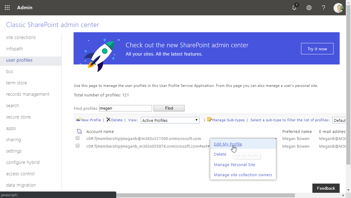 Now, when the new field exists, we can fill it with data. Return to the SharePoint Admin center and open Manage User Profiles.
