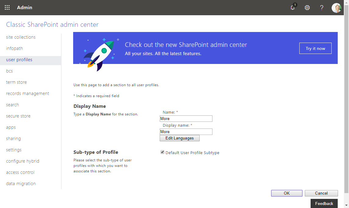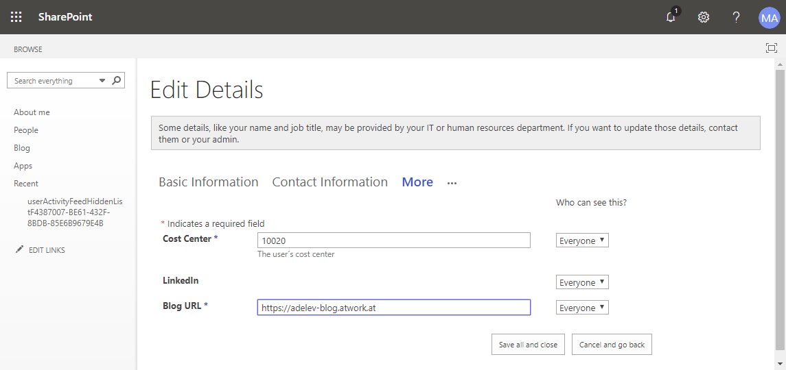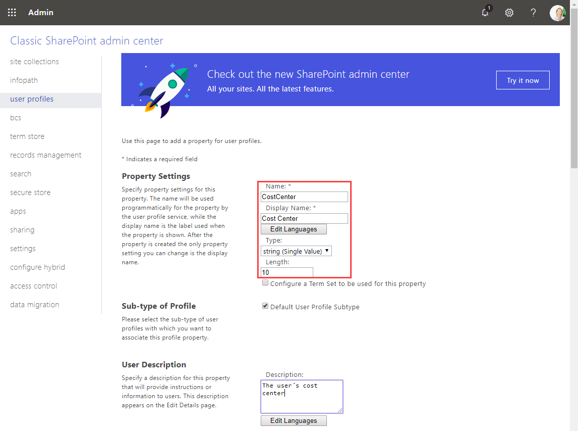 How to add custom user properties as a title, or more person details as a LinkedIn URL or a Blog URL, or information about a cost center or additional contact details? Well, this can be accomplished in the SharePoint Admin center as here.
