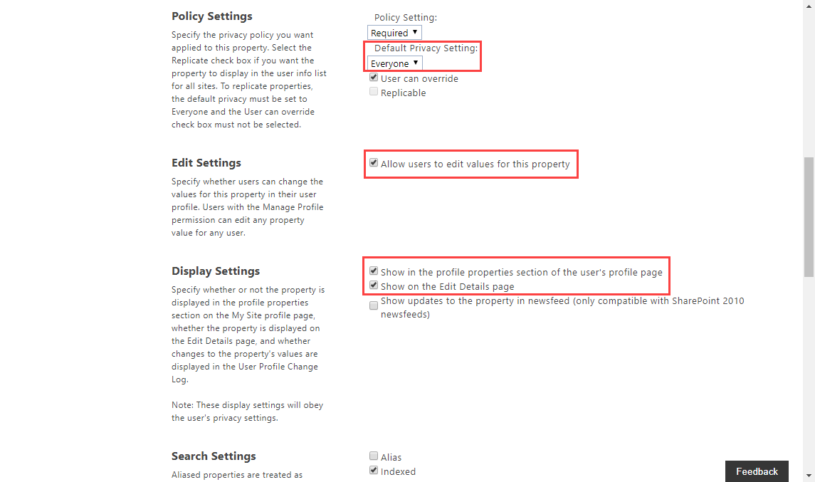 Important: Scroll down and set the Policy Settings to “Everyone” and check the Display Settings “[x] Show in the profile properties section of the user’s profile page” and “[x] Show on the Edit Details page” as follows. Usually, it´s a good idea to set “[x] Allow users to edit values for this property” as well to let each user modify this property.