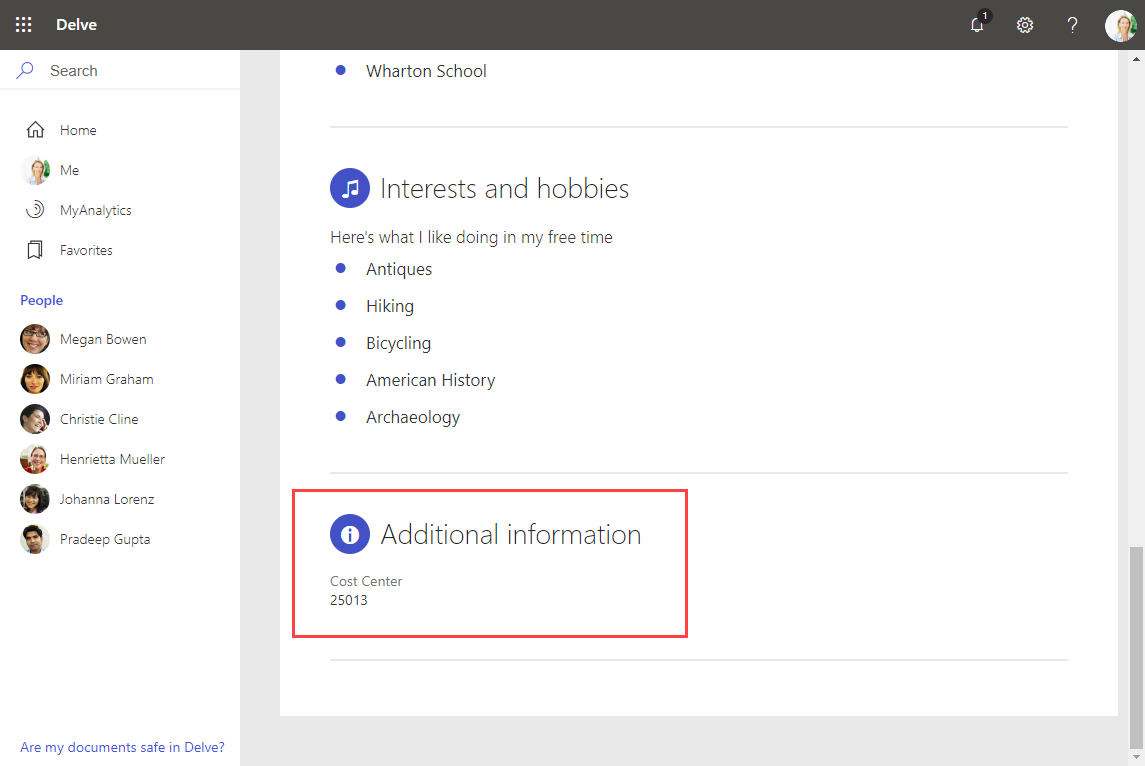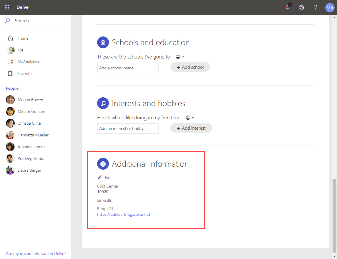 The Delve App allows to discover company and user data across Office 365. Unfortunately, while the app is very helpful, it can not be customized. Well, but we can easily add additional user information, such as personal data, a cost center, additional contact data or hyperlinks, etc. See how this works here.