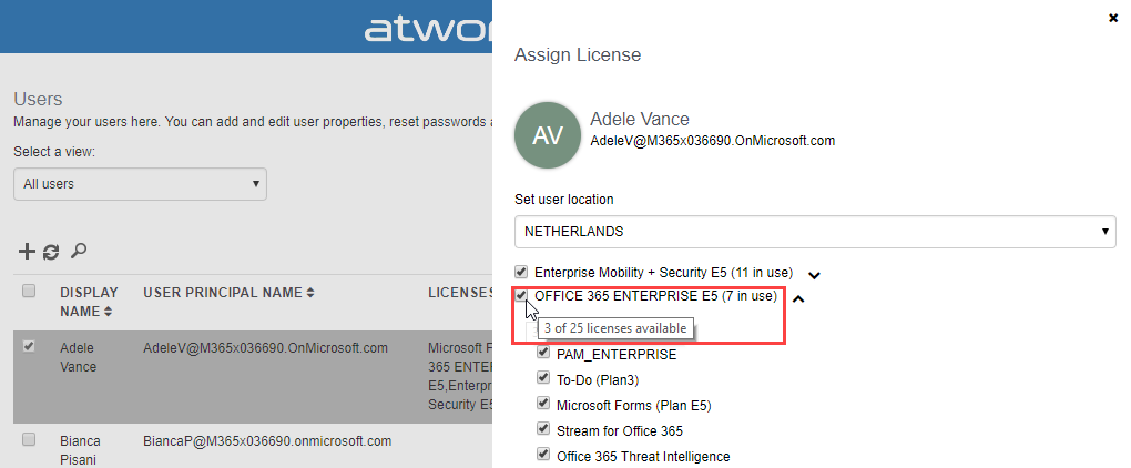 User license quick info: When hovering over a license checkbox in the user license panel, a new quick info informs about the license numbers that are available in the Office 365 tenant. This brings more transparency for admins to see if a license might be inactive because all licenses are assigned.