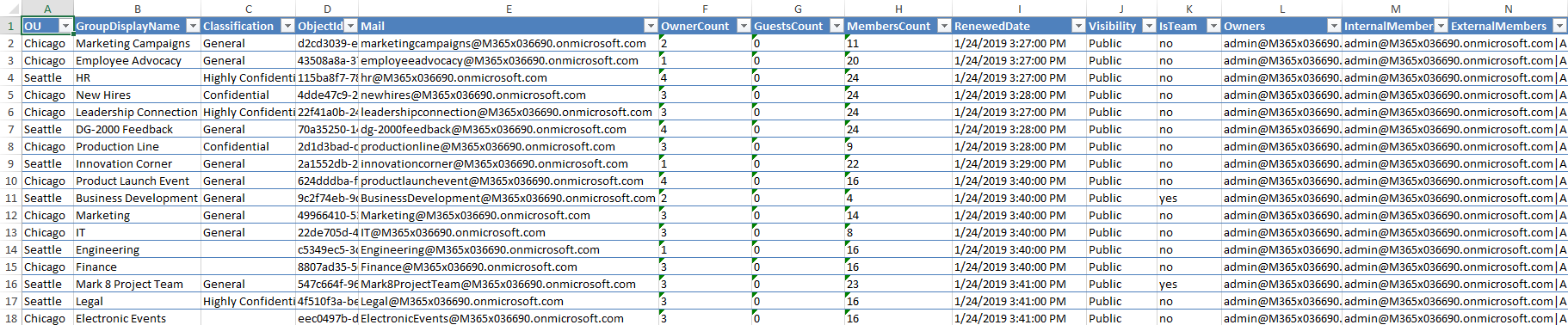The generated report delivers the following data: OU, GroupDisplayName, Classification, ObjectId, Mail, OwnerCount, GuestsCount, MembersCount, RenewedDate, Visibility, IsTeam, Owners, InternalMembers, ExternalMembers