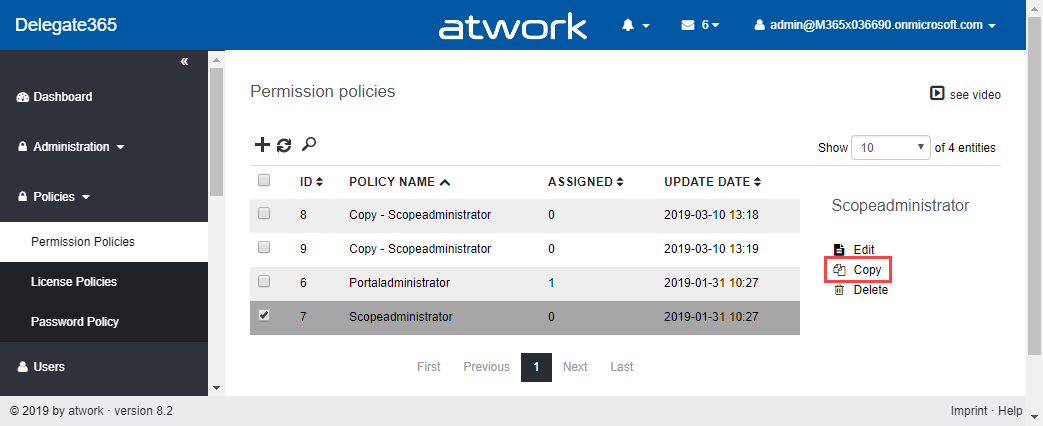 Copy a policy: An existing permission policy and a license policy can now be copied with the new menu to minimize the management effort. Confirm the message, and a copy with the name “Copy – [name]” policy is created, here it would be named “Copy - Scopeadministrator”.
