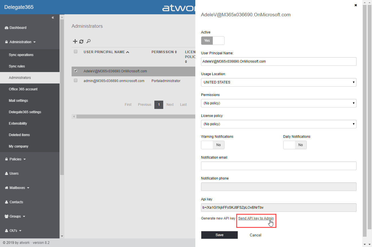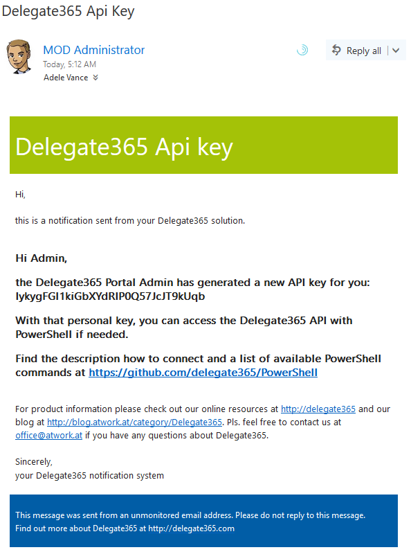 If a policy is copied, multiple times, the name is always “Copy – [name]”. It makes sense to rename the policy then anyways.Administrator send API key per email: A link* Send API key to Admin* has been added to directly send an API key to the administrator. This is useful to hand over that key when the administrator shall be able to use the Delegate365 PowerShell module.