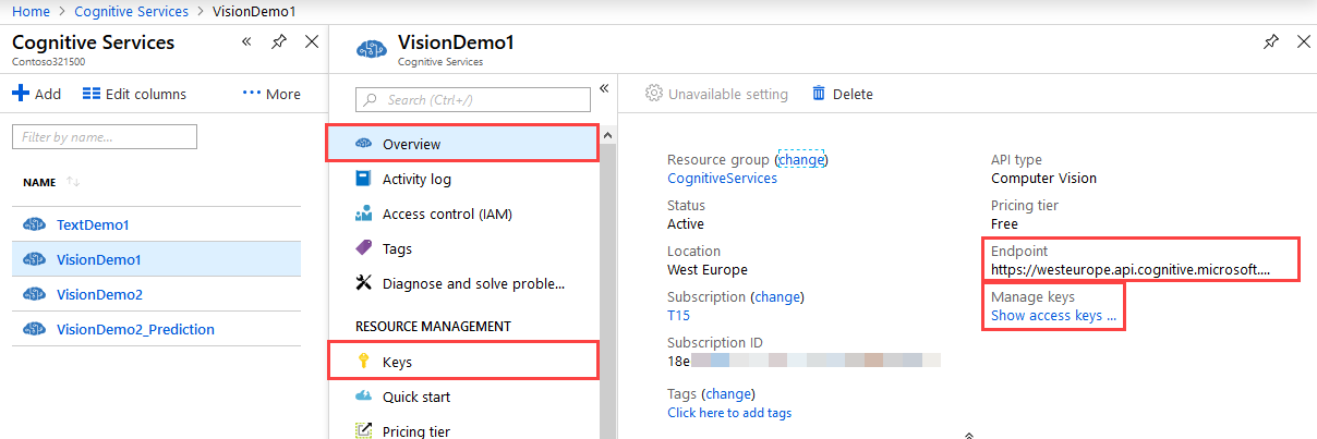 Computer Vision API - v1.0 informs about the service we want to consume (even if we are using v2). First, we need to create a new Cognitive Service and to get our own access data from the Azure Portal. Once created, we get that data in the service overview and in the keys menu.