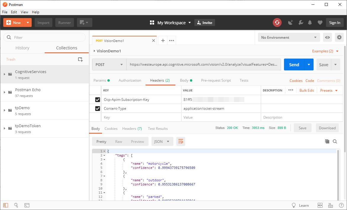 When clicking on the “Send” button, the request should be sent to the API. After some seconds of analyzing, the result will be shown as body, similar as here. The return data says, it’s a 99% chance that the photo shows a motorcycle, it’s 95% outdoor, it’s 94% parked, a description “a motorcycle parked on the side” and more details. Here’s the full output in JSON format.